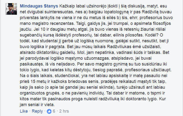 Informacija pasklido socialiniuose tinkluose ir į ją netrukus reaguoti pradėjo prof. V. Radžvilo kursus lankę VU TSPMI absolventai. Vienas absolventų, dabar aukštas Lietuvos Respublikos ambasados Čekijos Respublikoje antrojo sekretoriaus pareigas einantis Mindaugas Stanys į vykstančią diskusiją įsiliejo taip, kaip nesitikima iš Lietuvos valstybei diplomatinėje įstaigoje atstovaujančio žmogaus – necenzūriniais žodžiais.