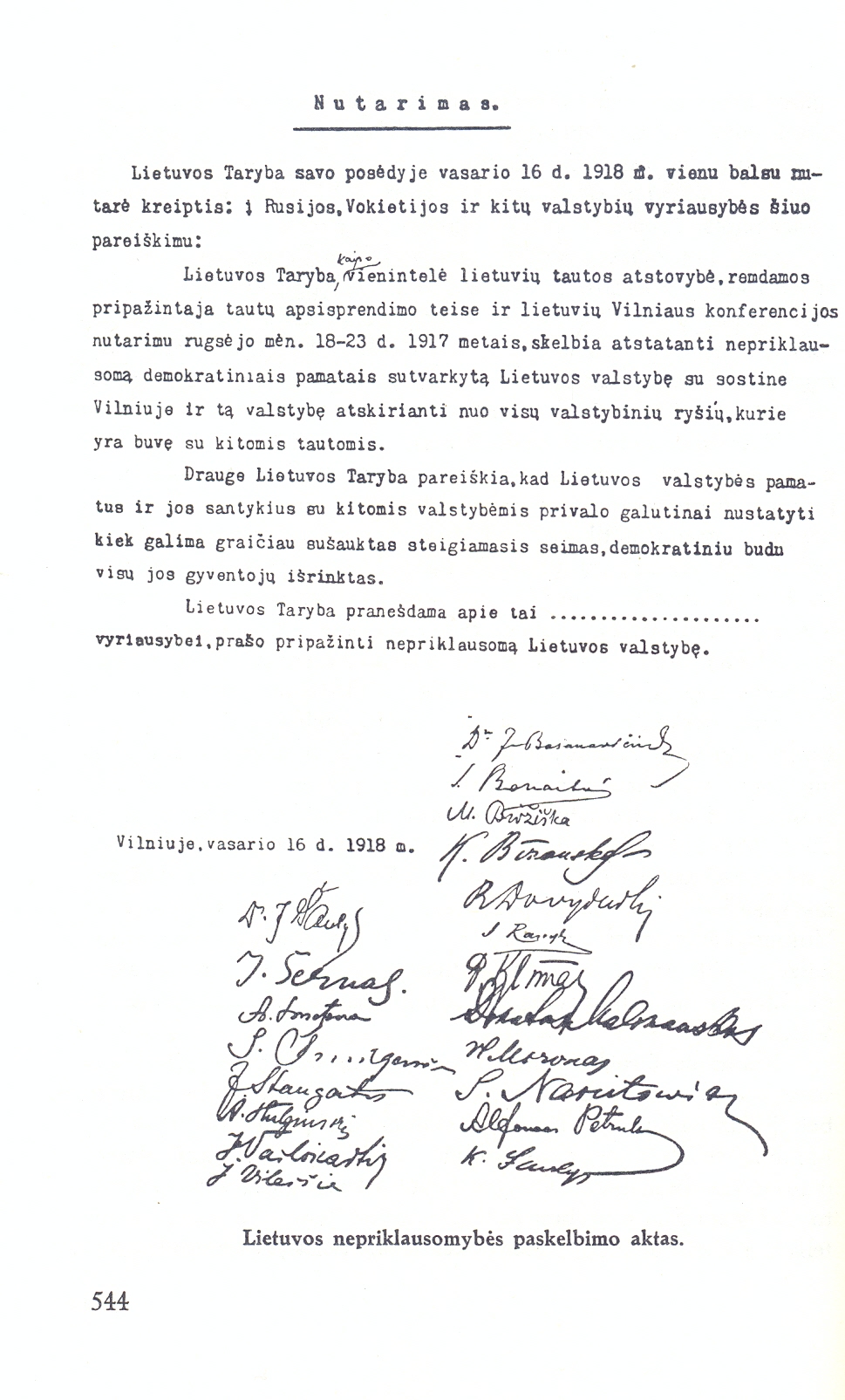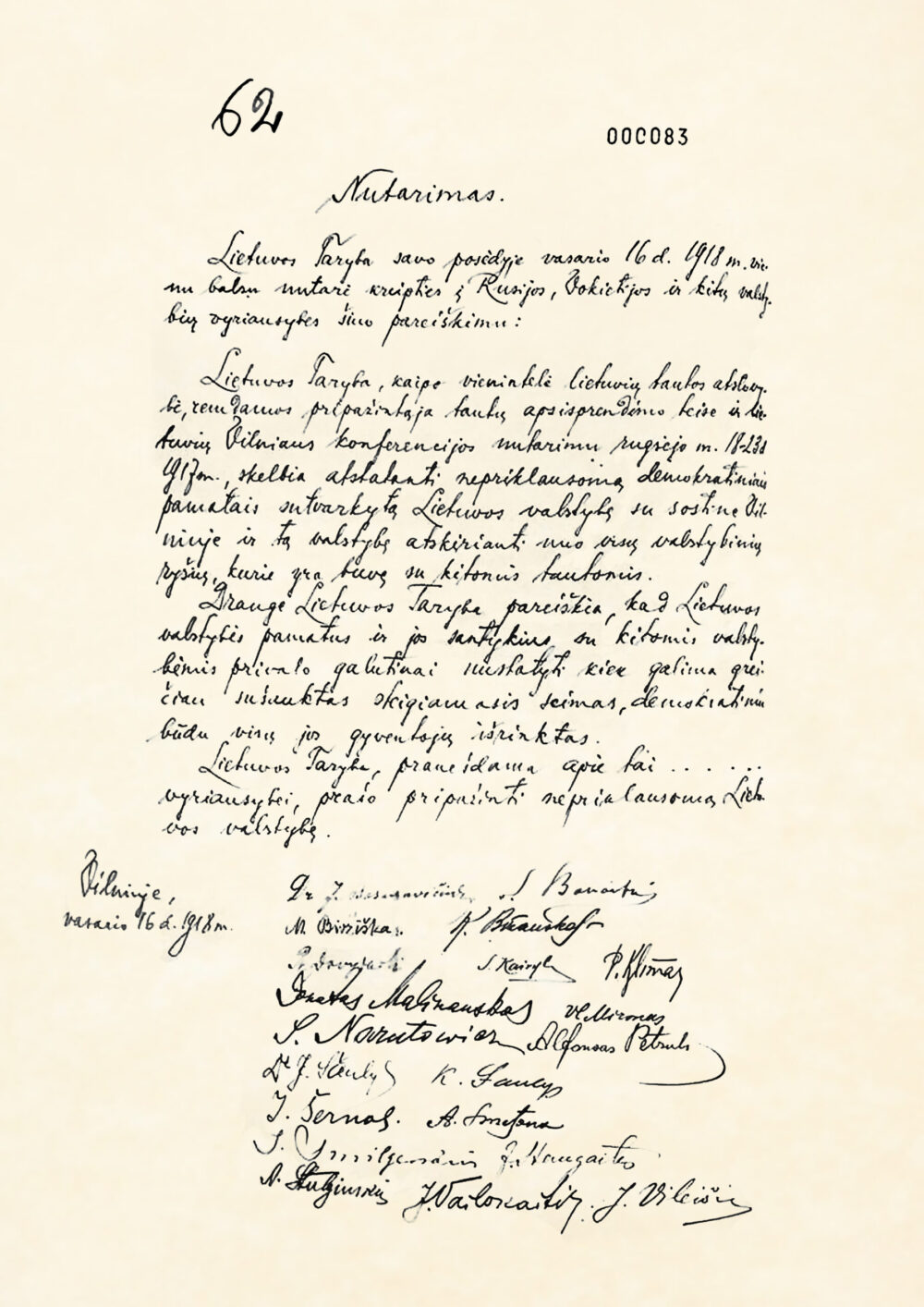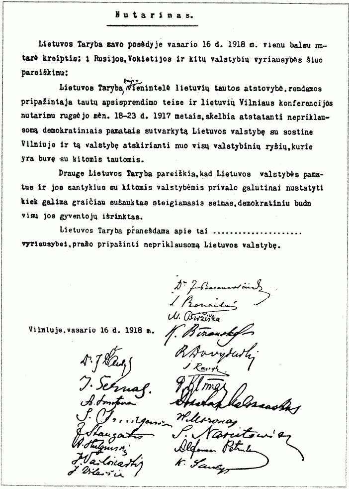 Ar dar kuri kita tauta per mažiau nei šimtmetį tiek kartų bandė atkurti savo valstybingumą? Net tada, kai atrodė, jog prošvaisčių tam nebėra ir laisvės viltis jau galutinai užgesinta, ją vis iš naujo įžiebdavo nenumaldomas laisvės troškimas. Vasario 16-osios Nutarimas, skelbdamas tikėjimą Lietuvos valstybe, tapo lietuvių savasties dalimi, vilties žiburiu, skatinančiu kurti ir įgyvendinti sėkmės vizijas.
