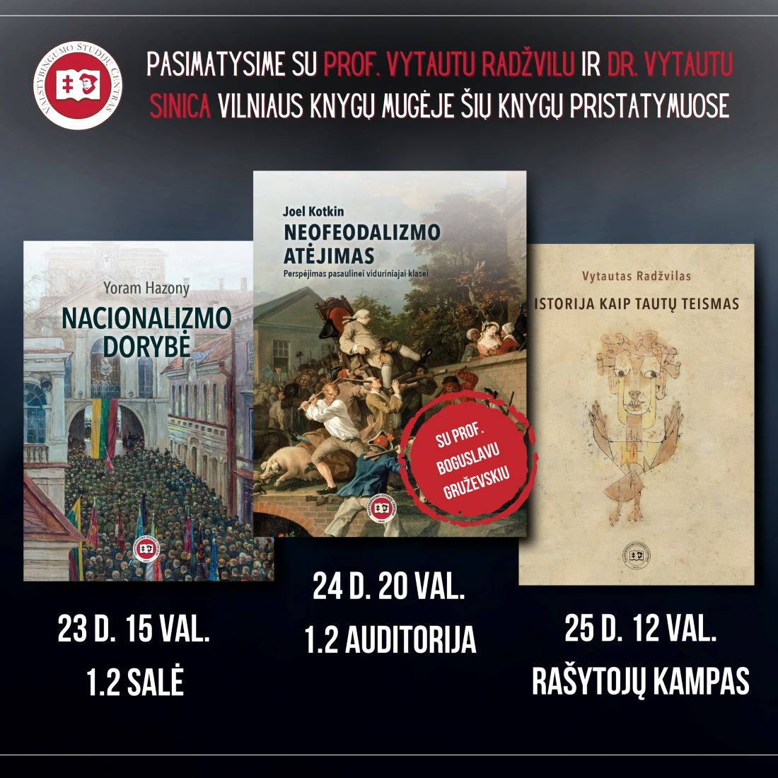 Šįkart lauksime jūsų Valstybingumo studijų centras su Versmės leidykla bendrame stende penktoje salėje, tad nepasiklyskite. Taip pat kviečiame į trijų naujausių centro leistų knygų pristatymą su prof. Radžvilu, manim ir, Kotkino knygos atveju, ir su prof. Boguslavu Gruževskiu. Į šį renginį šeštadienio vakarą kviečiu ypatingai – su prof. Gruževskiu, nepaprasto proto ir iškalbos mokslininku, renginį esame darę tik kartą ir jau gana seniai. Nesulaukiu pakartoti.